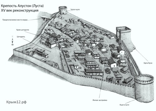 Вторая половина XIV века - период основания на полуострове генуэзских колоний на побережья от Балаклавы до Феодосии. В 1380 году генуэзцы договариваются с Золотой Ордой о владении крепости Алустон. Ожидая нападения властителей соседних княжеств, Генуэзцы восстанавливают и значительно расширяют крепость. Алустон опоясывают новой внешней крепостной стеной с тремя башнями, сложенными на песчано-известковом растворе из бута. В пространстве между цитаделью и новой крепостью находилась жилая застройка - обновленный Алустон мог защитить гораздо больше жителей возрожденного центра торговли.