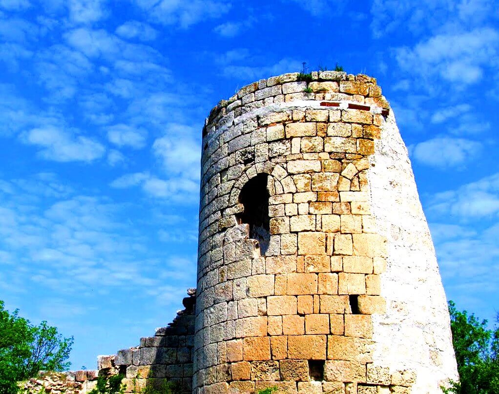 Наибольшее внимание привлекает башня. Она сложена из крупных известняковых блоков. Плиты ее облицовки меньше тех, которыми облицована стена. Башня была двухъяросной, межэтажные перекрытия в ней были деревянными. Об этом можно судить по квадратным гнездам для балок, на которые настился дощатый пол. Во второй этаж можно подняться по уцелевшей до наших дней каменной леснице.